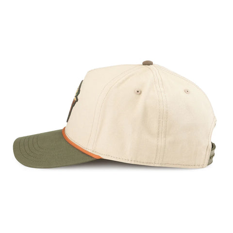 Brushed cotton twill 5-panel with structured crown in light Khaki. Contrast Orange paracord rope, slight curved visor and plastic snap closure in Army Green.